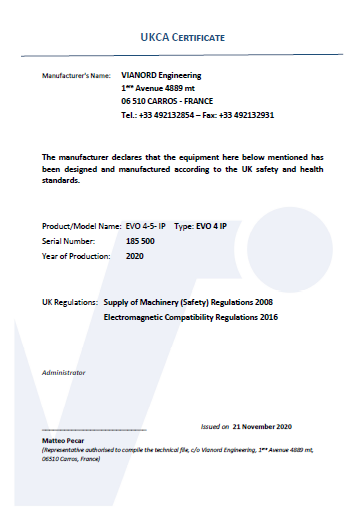 Vianord will be responsible for affixing the UKCA mark to the machines, which is the same principle as for CE marking.